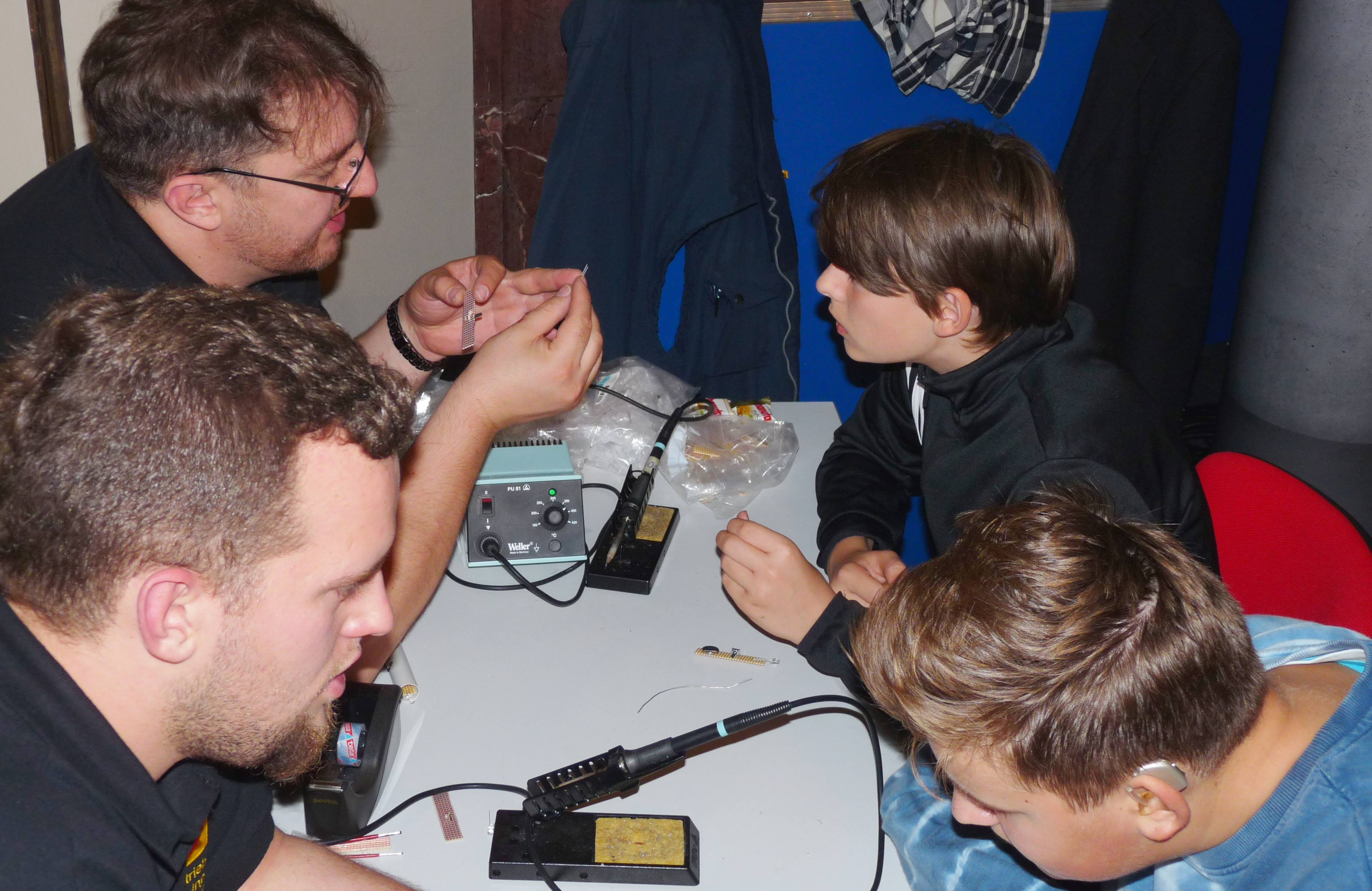 Ein besonderes Highlight für die Besucher war das selbstständige Herstellen einer Taschenlampe. Hierzu mussten die Jugendlichen eine Platine mit Bauelementen bestücken und verlöten. Dann wurde das Ganze zusammengebaut und die Funktion geprüft – ganz wie im wirklichen beruflichen Alltag.