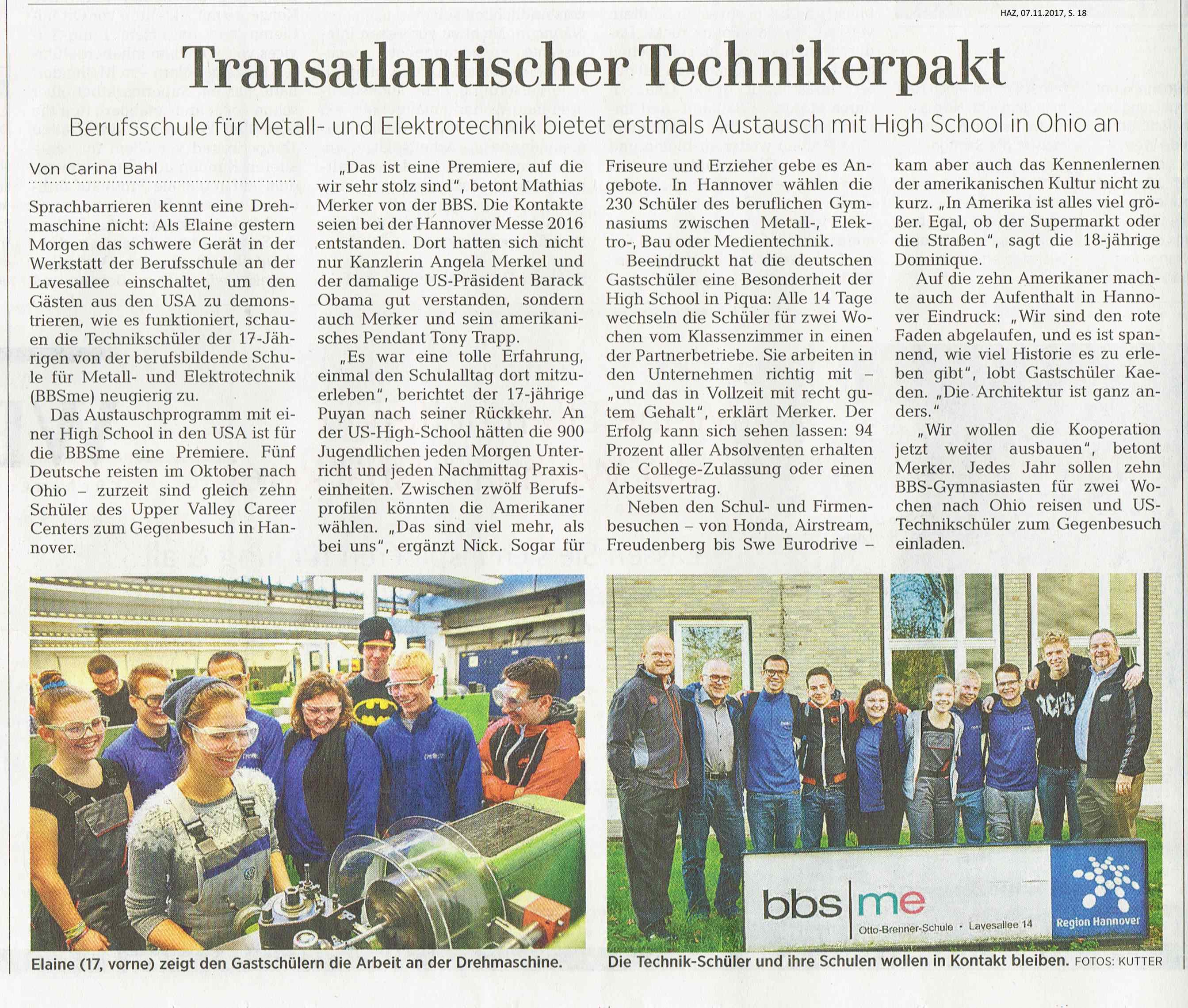Eine Schülergruppe der Klasse 12 des Beruflichen Gymnasiums Technik besuchte vom 22. September bis zum 07. Oktober 2017 das Uppervalley Career Center in Piqua, Ohio / USA. Es handelt sich um eine High School mit einem ähnlichen technischen Schwerpunkt wie unsere bbs|me. Unsere Schüler waren in Gastfamilien untergebracht und besuchen gemeinsam mit ihren neuen „Geschwistern“ den allgemeinbildenden und den technischen Unterricht. Etliche Betriebsbesichtigungen (Freudenberg, SEW Eurodrive, Honda, Airstream, Crown) boten unseren Schülern einen Einblick in dortige Produktionstechniken.