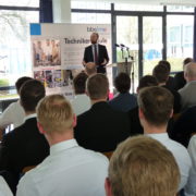 Nach der Eröffnung durch unseren Schulleiter Uwe Backs referierte Gastredner Claudio Koehler (26), ehemaliger Schüler unserer Technikerschule, über seinen beruflichen Werdegang bei seinem Arbeitgeber Volkwagen AG. Nach seiner Ausbildung zum Industriemechaniker wurde er zunächst nur am Fließband eingesetzt. Doch durch die Weiterbildung an unserer Technikerschule gelang es ihm, seine Talente zur Geltung zu bringen und durchzustarten. Als Techniker wurde er nun bei der Optimierung der Anlageneffizienz des Modells T6 eingesetzt. 100 Arbeitsplätze waren von ihm zu betreuen. Die nächste Aufgabe war Projektmanagement mithilfe eines Teams von 26 Leuten zur Anlaufsteuerung der Fertigung des Pickup-Modells Amarok, später beim Panamera in Leipzig. Auf Empfehlung seines Chefs gelangte er im Jahre 2016 in ein innerbetriebliches Förderprogramm. Heute verantwortet er die Auftragsvergabe für Kunststoff-Spritzgussteile für den T7, also beispielsweise Stoßfänger oder Seitenanbauteile und ist viel in Stuttgart, München u.a. unterwegs.