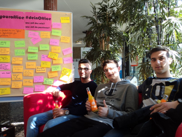 In der Eingangshalle der Hannah-Arendt-Schule kannst Du Deine Wünsche und Ideen einbringen und mit anderen darüber sprechen. Für welche Themen und Ziele sollte Deiner Meinung nach ein “Beteiligungsbüro” eintreten?