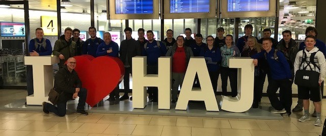 Pünktlicher als die Bahn, ist am Freitag die Schüler*innengruppe vom Upper Valley Career Center in Piqua, Ohio am Flughafen Hannover Langenhagen gelandet. Sie sind für eine Woche zu Gast an der bbs|me und bei den Familien unserer Schüler*innen, die im vergangenen November in Ohio waren. Die Schüler*innen haben am UVCC alle einen beruflichen Ausbildungsschwerpunkt aus den Bereichen Metall- und Elektrotechnik sowie Produktdesign gewählt. Die Gruppe wird von Tony Trapp und Matt Meier begleitet.