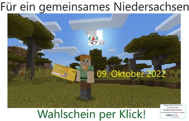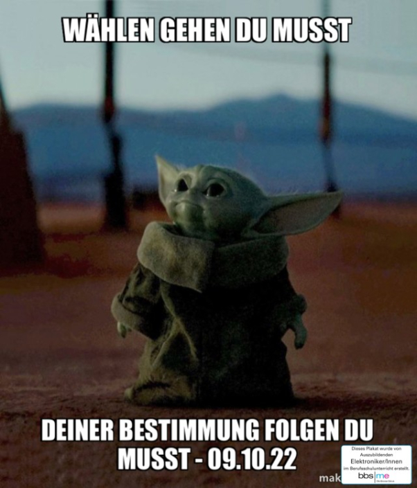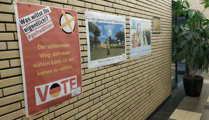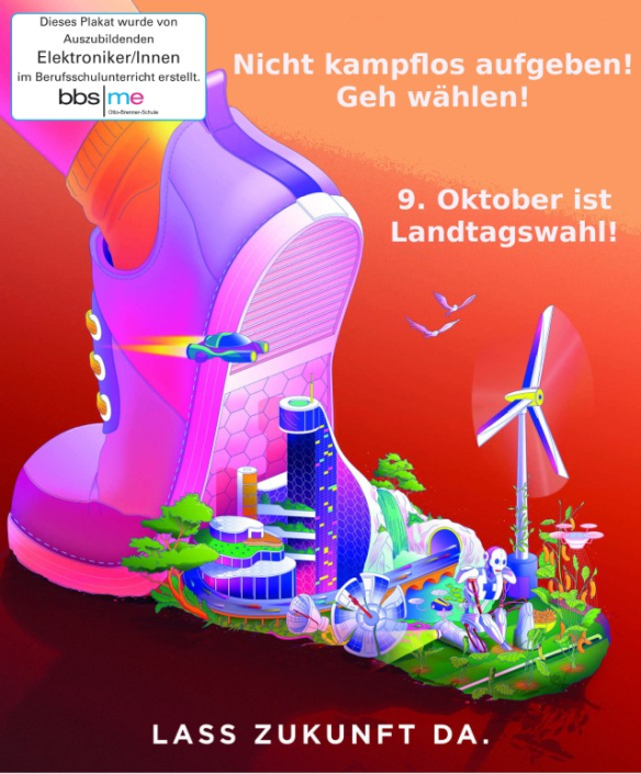 Dabei herausgekommen sind Plakate, die nicht für Parteien werben, sondern für die Teilnahme an der Wahl. Einige der Plakate, die zum Teil provokativ und auf jeden Fall mit einem Augenzwinkern versehen sind, hängen in unseren Pausenhallen in den drei Gebäuden unserer Schule.