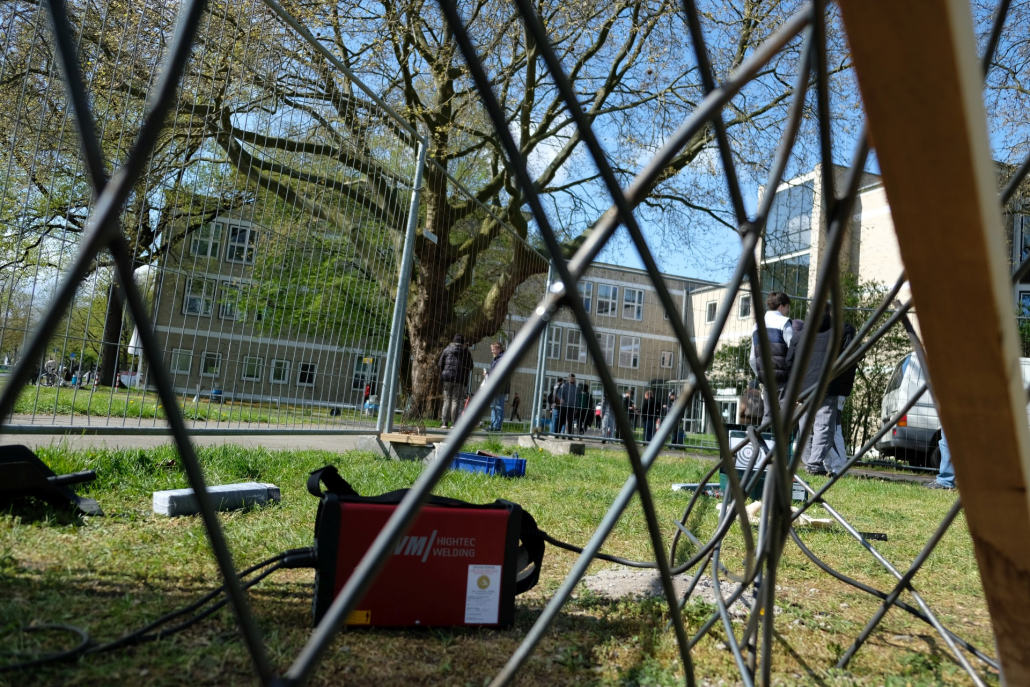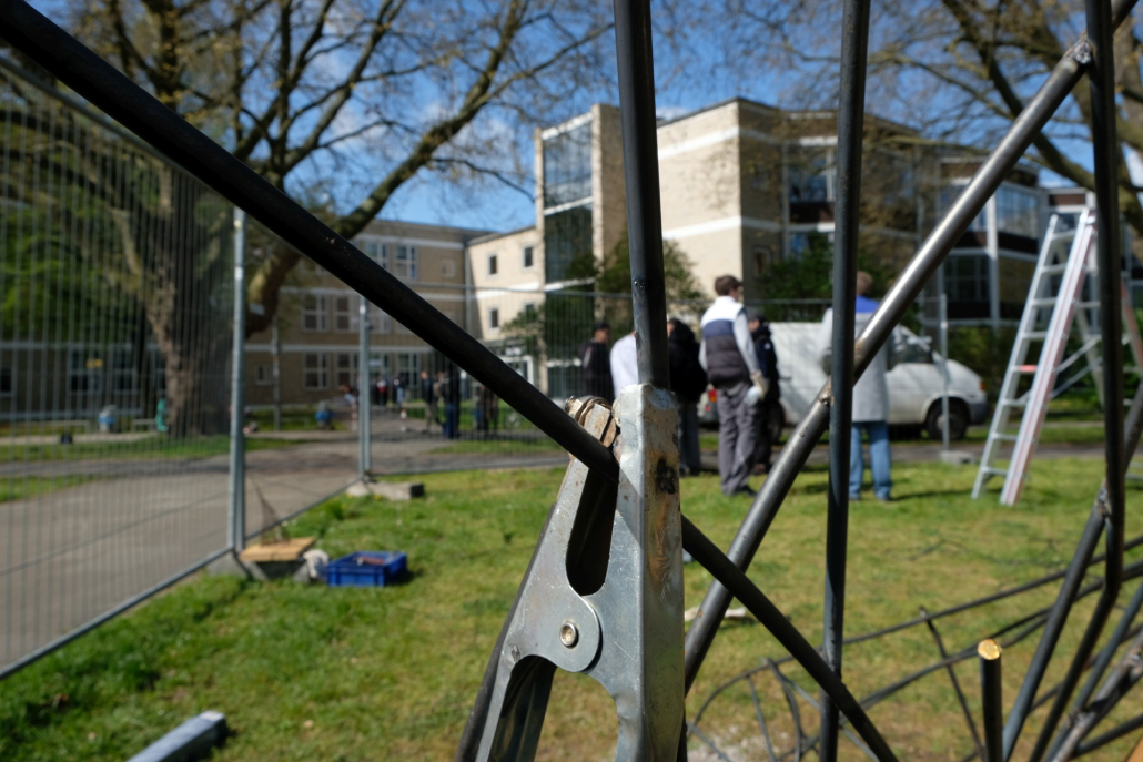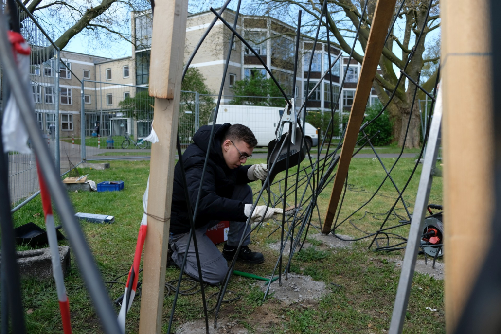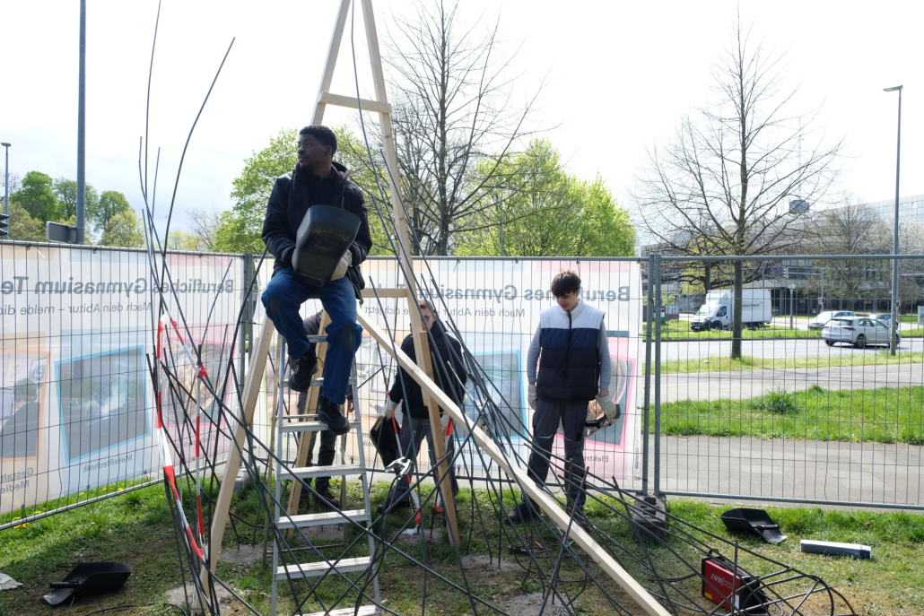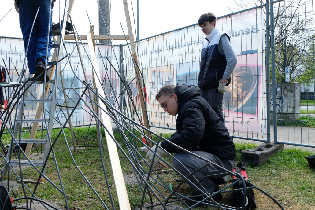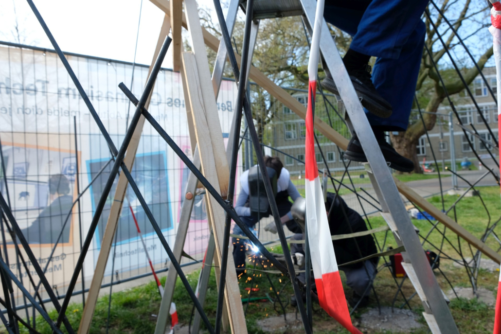 Das wechselhafte Wetter ficht die Schülergruppe aus der Klasse BFSMA22 nicht an, die zusammen mit ihrem Lehrer Martin Hansel vor dem Eingang der BBS-ME bei der Arbeit sind. Mit Eifer schneiden sie Stahlstäbe auf die erforderlichen Längen, biegen die Stäbe, geben ihnen Form und Halt. Sie haben den ersten Satz Stäbe einbetoniert und verbinden diese jetzt untereinander durch Schweißen. Mit jedem weiteren Stab, mit jeder weiteren Schweißverbindung nimmt die Skulptur “Raumfühler” Gestalt an.