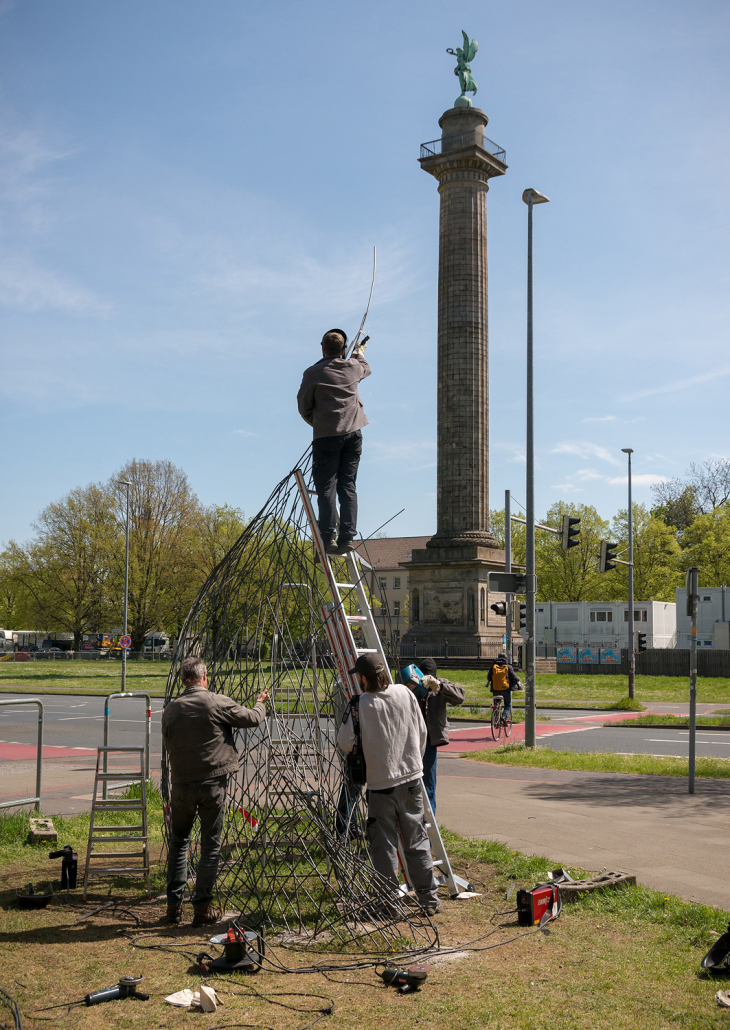 - Nachhaltigkeit: Die Lebenszeit der Skulpturengruppe kann baulich auf bis zu 20 Jahre angelegt sein, aber auch ein Rückbau nach ein paar Jahren ist kein Problem, weil das Material gut wiederverwertbar ist und die Fundamente klein sind.
