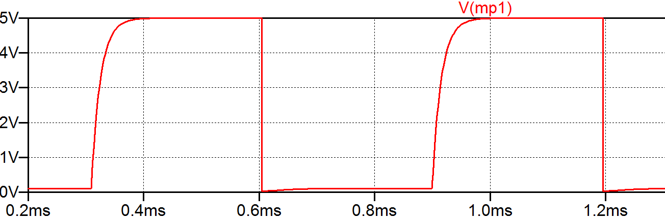 Nachfolgend dargestelltes Signal ist das Ausgangssignal der „A-stabilen-Kippstufe“. Es führt sowohl zum Sensor als auch zum Lautsprecher. Der Sensor sendet ein Infrarotsignal aus, welches auf der Oberfläche der Flüssigkeit reflektiert wird, dann vom Sensor weiterverarbeitet und an den Verstärker weitergeleitet wird. Es handelt sich hierbei um ein Impulssignal.