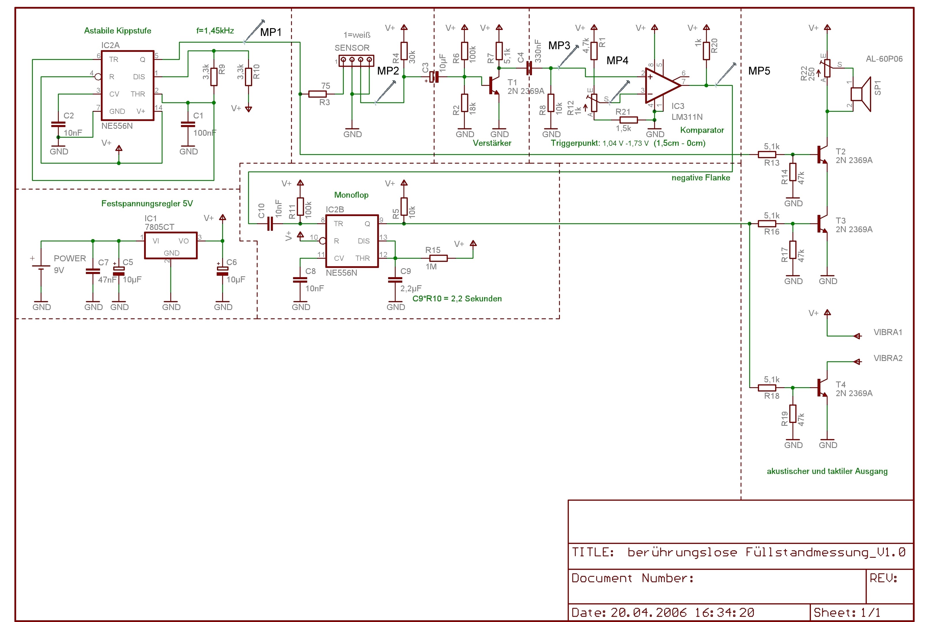 Im Kurs werden elektrotechnische Schaltungen analysiert und verändert. Bei der Analyse teilt man den Schaltplan in Funktionsblöcke und erarbeitet jede einzelne Funktion. Dabei analysiert man auch die Funktion von einzelnen Bauteile. Kennt man alle Teilfunktionen kann man auf die Gesamtfunktion schließen. Bei der Ermittlung der Funktionen geht man immer nach dem EVA-Prinzip voran. Ein Signal kommt rein (Eingang), dieses wird verarbeitet (V), verändert und an den Ausgang (A) weiter gegeben. Nachfolgend sehen wir als Beispielschaltplan einen Tassenfüllstandswarner. Der Schaltplan ist bereits in Funktionsblöcke (gestrichelte Linien) aufgeteilt.