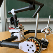 Das vom Multicoper aufgenommene Bild zeigt eine Gruppe von Teilnehmern im Drohnenflug-Labor.