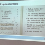 Nach einer kurzen Pause ging es dann mit einer Gruppenarbeit weiter. Dabei sollte in einer Gruppe mit Hilfe von Kreppband, Spaghetti, einem Stück Seil, einer Schere und einem Marshmallow ein Turm gebaut werden (-> Marshmallow-Challenge). Ziel war es, den höchsten Turm zu errichten.