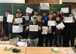Die beiden Respekt Coaches mit Vertretern der gemeinsamen BES bei der Übergabe des Tischkickers.