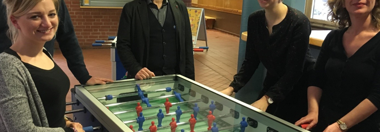 Die beiden Respekt Coaches mit Vertretern der gemeinsamen BES bei der Übergabe des Tischkickers.